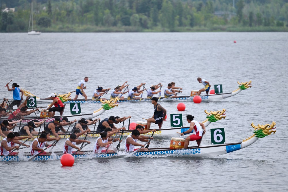 8月9日,成都世运会龙舟项目在兴隆湖开赛,这是拥有千年历史的龙舟首次登上世运会正赛舞台。图为10人座200米预赛比赛现场。(图片由CNSPHOTO提供)