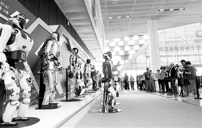 在2024世界人工智能大会,一组人形机器人在展览入口处进行集中展示