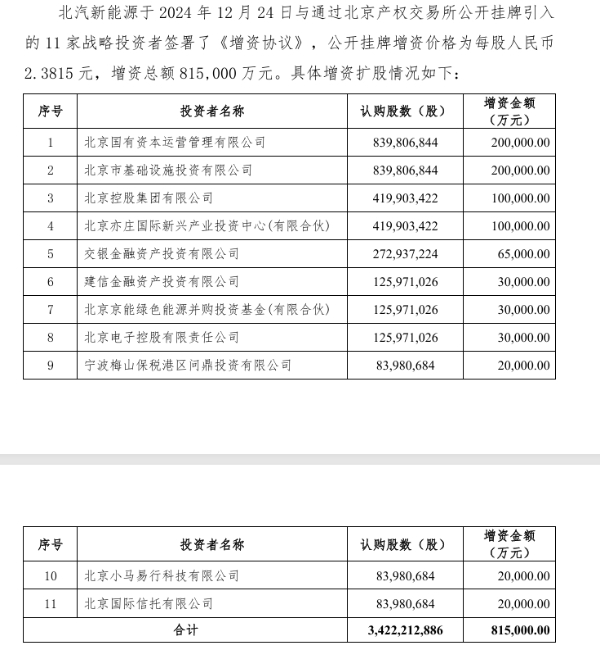 公告中显示,此前,北汽新能源已于2024年12月13日与北京汽车股份有限公司(以下简称“北京汽车”)签署了《增资协议》,北京汽车以非公开协议方式向北汽新能源增资20亿元。北汽新能源本轮以非公开协议增资及公开挂牌增资总额合计为101.5亿元。