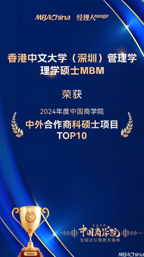 香港中文大学(深圳)管理学理学硕士MBM项目荣获“2024年度中国商学院中外合作商科硕士项目TOP10”第1名!