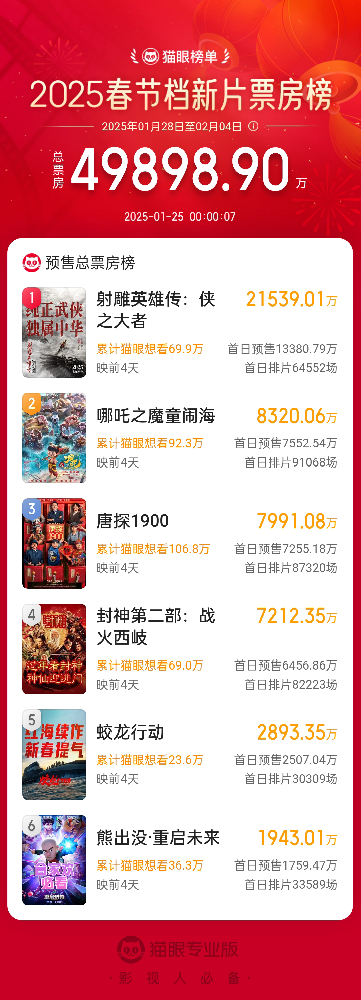 截止到1月25日0时许,2025年电影春节档的预售总票房已接近5亿元。“现在离大年初一还有四五天的时间,照此速度,最终的预售成绩有望超过10亿元。”一位影院管理公司的人士向《中国经营报》记者说道。