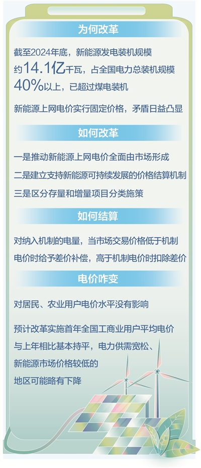 改革主要内容有三方面。一是推动新能源上网电价全面由市场形成。新能源项目上网电量原则上全部进入电力市场,上网电价通过市场交易形成。二是建立支持新能源可持续发展的价格结算机制。新能源参与市场交易后,在结算环节建立可持续发展价格结算机制,对纳入机制的电量,按机制电价结算。三是区分存量和增量项目分类施策。存量项目的机制电价与现行政策妥善衔接,增量项目的机制电价通过市场化竞价方式确定。