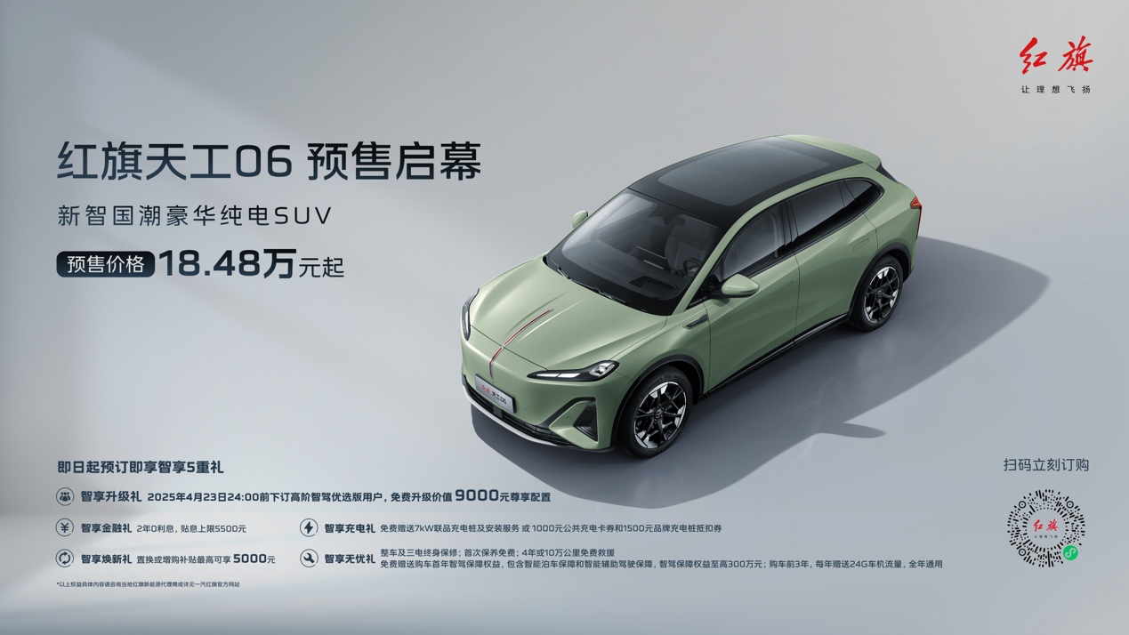 天工06定位新智国潮豪华纯电SUV,除搭载了与天工05相同的司南智驾系统和灵犀座舱外,还配备了专属超级适时智能四驱系统,拥有毫秒级的四驱介入响应,既可为用户提供卓越的四驱驾乘体验,又能让用户享受两驱的极低电耗。此次红旗品牌智能体验日天工06正式开启预售,预售价格18.48万元起,并带来丰厚的“智享五重礼”预订权益。